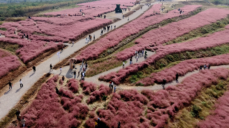 金秋の季節となり、中国全土は紅葉や黄金色の稻穂など、色彩豊かな秋の装いに変わり、魅力的な秋景色が広がっている。こうした美しい自然風光は、都市部からの観光客を含む多くの人々を惹きつけ、彼らは休日を利用して郊外や観光地へ出かけ、秋の景色を鑑賞し、自然に身を委ねるレジャーを楽しんでいる。平邑県の粉黛乱子草花畑は、近年人気の高まる「网红スポット」(SNSで話題の場所)の一つで、柔らかなピンク色の花穂が広がる景色が、多くの写真愛好家や家族連れの観光客を集めている。