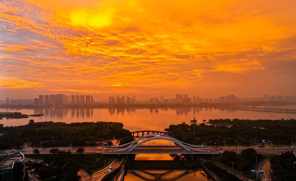 10月4日の明け方6時、臨沂市ではしばらく続いた靄かかった小雨がやみ、東の空から朝日がゆっくりと昇り出た。上空には、朝日によって万道の光が射し、空の広がりを赤く染め上げる中、たまたま一道の虹がそれと呼応するように現れ、朝焼けと虹が一緒にフレームに収まる珍しい絶景が形成された。