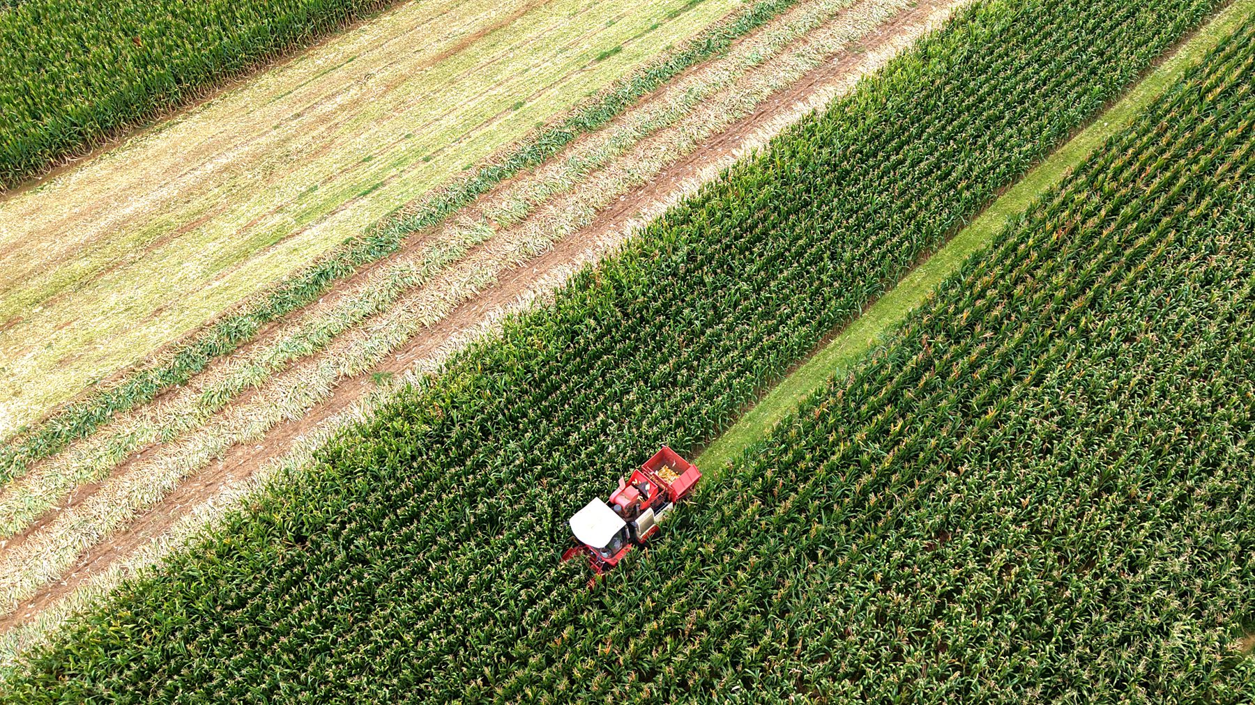 秋の深まりを迎えた山東省沂蒙地方では、広大な農地に黄金色の稲穂が重力に負けて垂れ下がり、一帯に連なるトウモロコシが太陽の光を浴びて鮮やかな黄色に染まっている。田んぼの中では、大型収穫機が泥濘った土壌を切り開きながら前進し、収穫した穀物を積載したトラックが往来し、忙しい収穫の風景が広がっている。