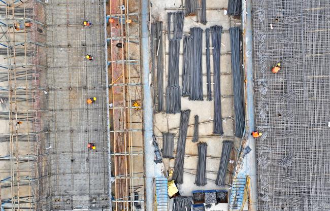 新年早々、国家重点プロジェクトである潍坊-宿遷間高速鉄道の郯城工区では、建設者たちが現場を離れることなく工期を追い込み、工区の工事を緻密に推進している。写真は、中国鉄道上海局郯城製梁場の従業員たちが潍宿高速鉄道郯城工区で作業を行う様子をドローンで撮影したものだ。编辑:杜凤蕾