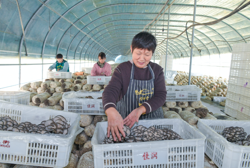 12月8日、羅荘区高都街道に所在する山東効峰生物科技有限公司の菌茸栽培ハウスでは、農家たちが成熟期を迎えた菌茸を忙しく収穫している。同社は農作物の残渣(もみ殻、稲藁など)を菌茸の栽培基材として有効活用し、食用菌の研究開発、生産、加工、販売を一貫して行う科技型近代農業企業として成長している。