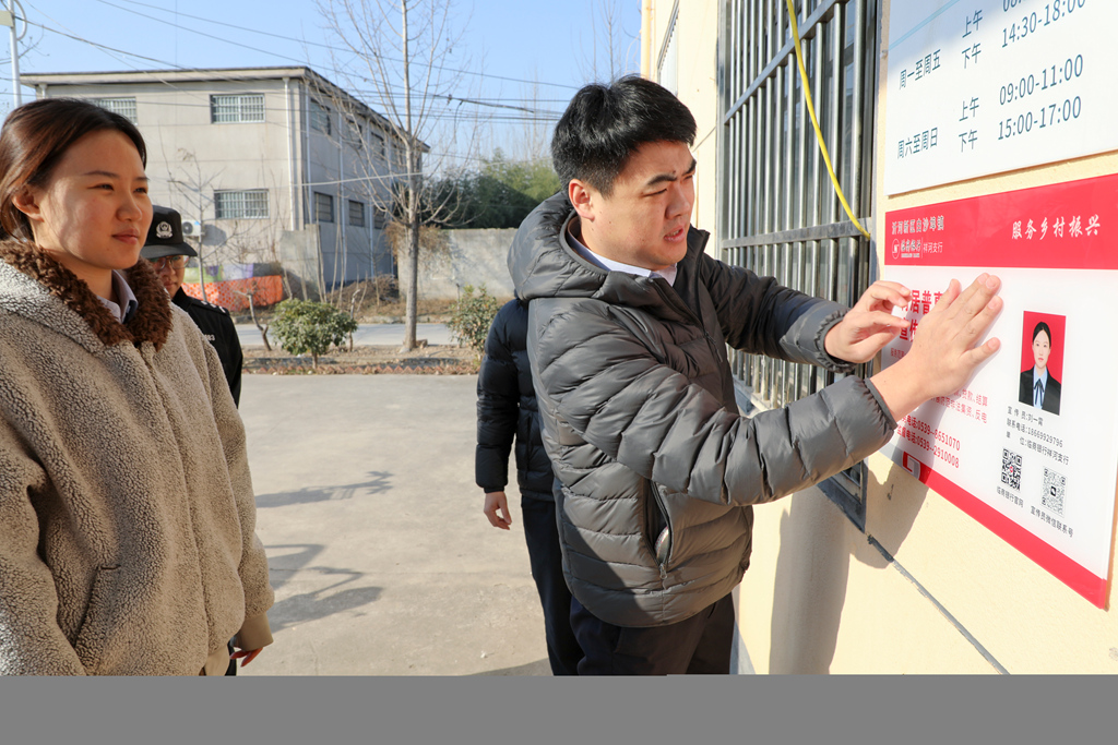 12月9日、沂河新区白沙埠鎮朱潘工作区の管轄村では、銀行の職員たちが普惠金融宣伝員の連絡先プレートを張り付けている。