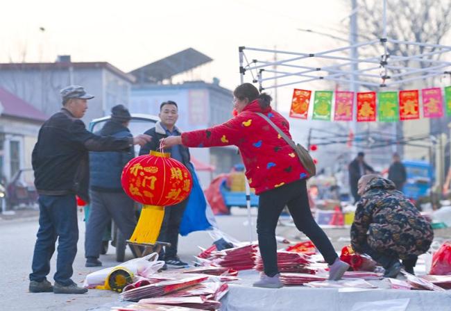2月11日夕方、沂南県双堠鎮梭荘村の正月市場は非常ににぎわった。真っ赤なちょうちんや縁起のよい春聯(対聯)が所狭しと並び、村民たちは行き交いながら正月用品を選び、新年を喜ぶ楽しい雰囲気に包まれていた。