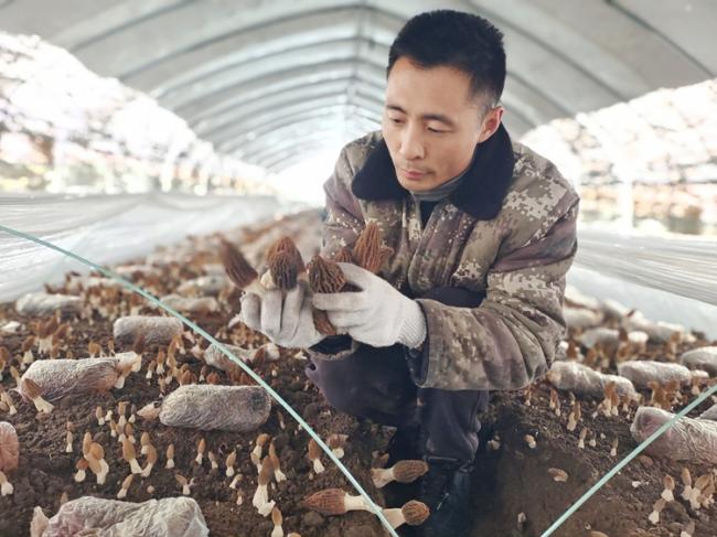 春爛漫の季節、平邑県保太鎮冷蔵村にある吉フン菌業専門合作社では、塔のような形の羊肚菌が次々と発生し、百花に負けじと姿を現している。