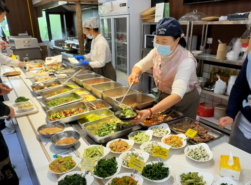 4月21日午前11時、王庄路北端に位置する同街区食堂は既ににぎやかな雰囲気に包まれていた。カウンターには豚の角煮や旬の野菜炒めなど料理が並び、保温ライトの下で湯気が立ちのぼる。営業を終えた商店主や周辺の住民が集まり、昼食を選んでいる姿が見られる。