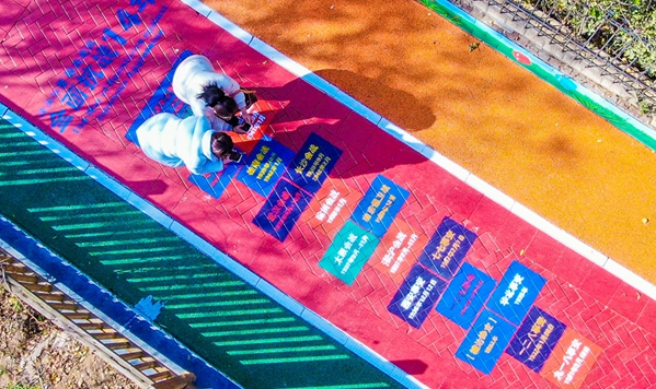 12月1日、臨沂市北城新区の杏園小区では、区内遊歩道に描かた愛国教育関連の文字が複数の市民の注意を引き、彼らは足を止めて写真を撮っていた。